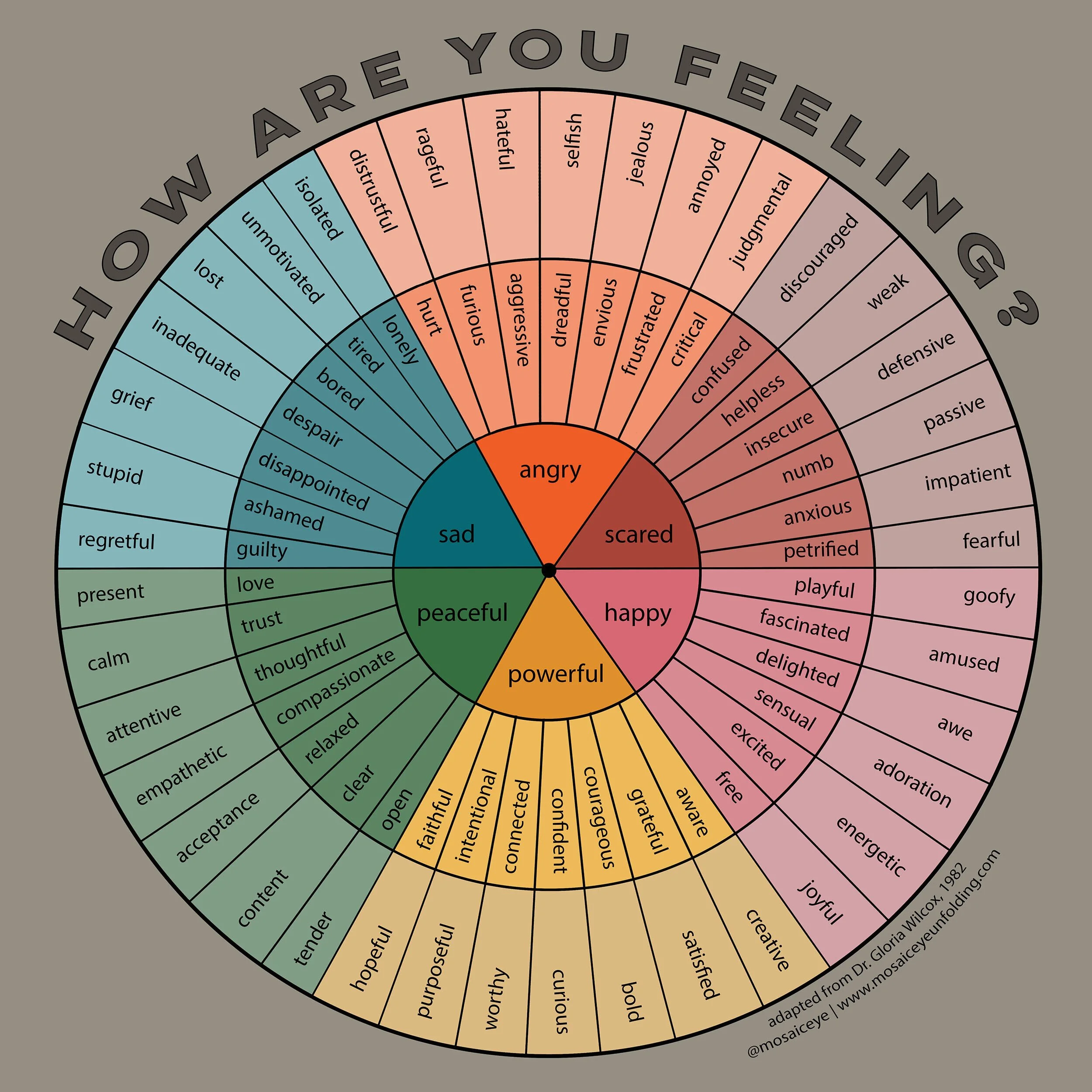 Plan intentional weekly check-ins with yourself. The feelings wheel is an amazing tool to utilize daily as you reorient and understand where and how you are.